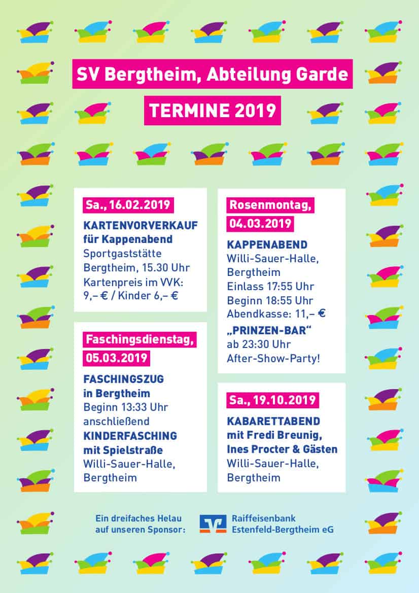 Am 2. Mai 2007 wurde die Abteilung Garde durch den Elferrat aus der Taufe gehoben. Seither werden die Faschingsveranstaltungen des SV Bergtheim durch den Elferrat organisiert. Hierbei kümmern wir uns um das Programm, die musikalische Begleitung unserer Veranstaltungen als auch den kompletten Ablauf. Bei den Veranstaltungen können wir stets auf die Unterstützung des Hauptvereins und seiner Abteilungen zurückgreifen.
