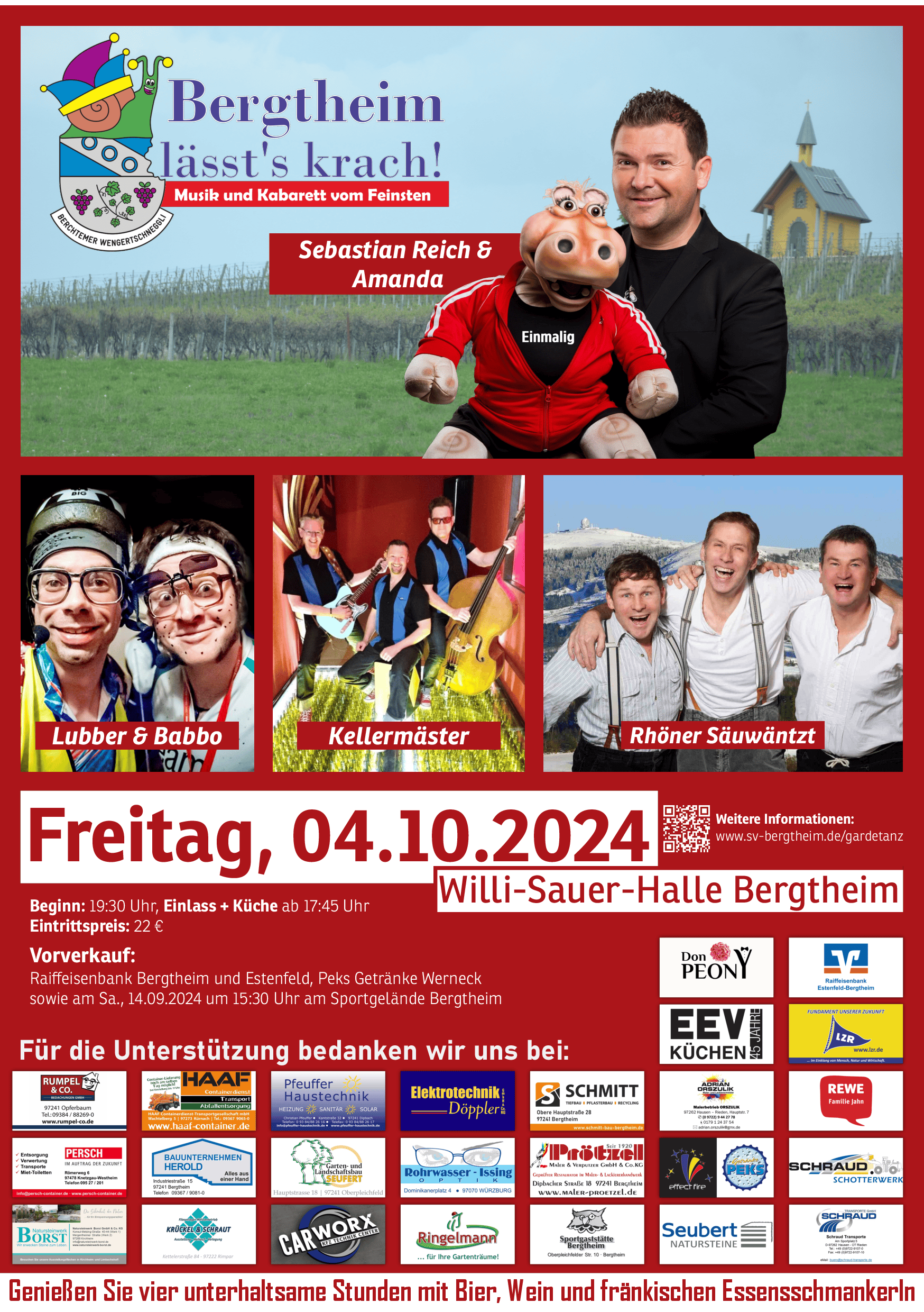 Am 19.10.2019 stieg der Kabarettabend der Abteilung Garde erstmals unter dem Motto "Bergtheim lässt's krach". Zu Beginn des neuen Formates waren dann gleich Kabarettgrößen wie Fredi Breunig, Otmar Schraud und Weinbäuerle Günter Stock zugast. Besonders hat uns gefreut, dass die Rhöner Kultband Spilk in Bergtheim erstmals überhaupt im Landkreis Würzburg aufgetreten ist. Mit knapp 400 Gästen hat es richtig gekracht, wofür wir mehr als dankbar sind.